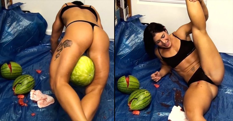 La spacca-angurie si presenta maliziosa in video: non indossa una tuta o un costume intero, ma un tanga quasi invisibile e tacchi alti fetish, e la posizione scelta per stritolare i malcapitati frutti è un quattro zampe a favor di telecamera. E’ chiaro l’intento delle sue fatiche: mostrare gli effetti degli allenamenti ed eccitare uomini (e donne) che cercano femmine potenti e gajarde.