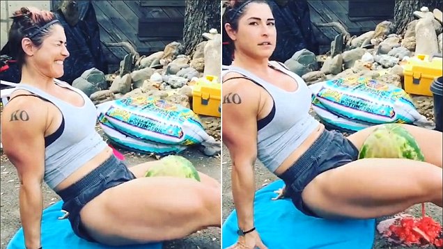 E’ Kortney Olson, una personal trainer australiana che si è specializzata in una bizzarra disciplina: spaccare cocomeri con le sue poderose cosce. La ragazza è allenatrice della squadra olimpica di sollevamento pesi, campionessa di braccio di ferro, e ama mostrare le sue tenaglie umane.