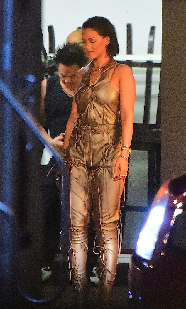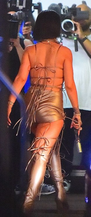 Nella città della Florida, la cantante 28enne è stata ripresa mentre sale su una moto con un abito audace, fatto di lacci dettagli e spaccature in stile halterneck. Nella parte superiore, la tuta metallica color oro è ben chiusa. Nella parte posteriore invece, le cosce sono scoperte proprio esattamente sotto ai glutei. La schiena è invece addobbata dai lacci del vestito.