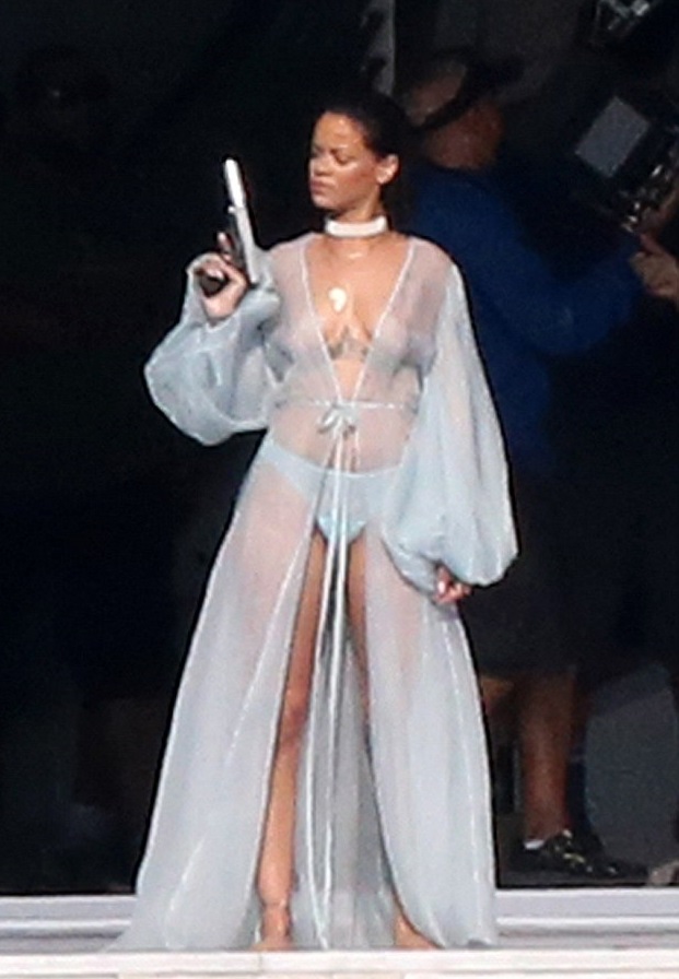 MIAMI – Rihanna si trova in questi giorni a Miami dove sta girando il suo prossimo video. Qui, la cantante delle Barbados ha sfoggiato una sexy vestaglia ed è stata immortalata con la pistola in mano e lo sguardo da dura.