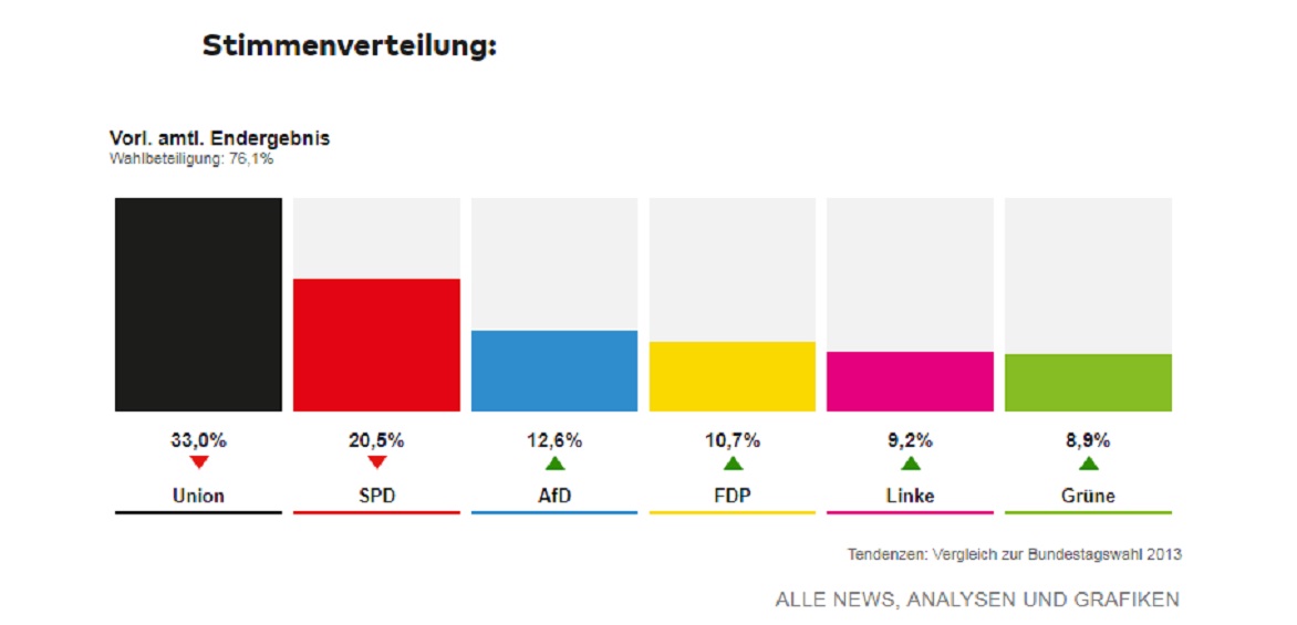 “Il fatto che siano sei i partiti ad entrare in Parlamento è una novità nel sistema politico tedesco, novità che spezzetterà la maggioranza e potrebbe costringere Merkel a una difficile ‘navigazione’. Scontata la conferma di Merkel come cancelliera, anche se non è chiaro quali partiti sosterranno il suo governo. “È una pesante sconfitta per l’SPD, oggi finisce per noi la grande coalizione”, ha detto Manuela Schwesig, una delle esponenti di spicco dell’SDP. Parole confermate poco dopo dal leader del partito: “Andremo all’opposizione”.