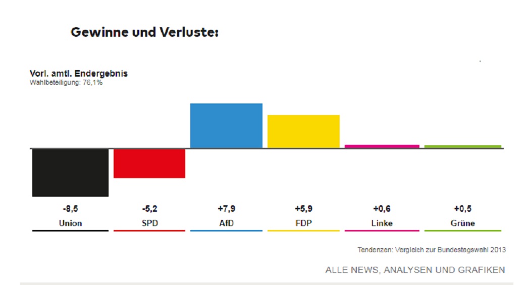 Alessio Sgherza su Repubblica scrive che per entrambi i partiti storici di Cdu e Spd, si tratta del risultato peggiore alle elezioni in Germania dal 1950 ad oggi. Esulta invece l’ultradestra di Afd, che per la prima volta entra in Parlamento e lo fa con un sonoro 13%, contro il 5 % del 2013, segno che i consensi sono più che raddoppiati: