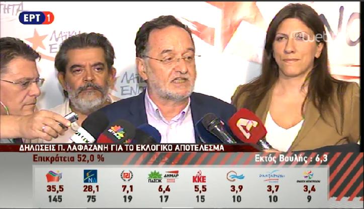 Gli scissionisti di Syriza, guidati dall’ex ministro Panagiotis Lazafanis e dalla presidente della Voulì Zoe Konstantopoulou, hanno fondato il partito Laiki Enotita, “Unità popolare”, che non è entrato in parlamento essendosi fermato al 2,8% dei voti.