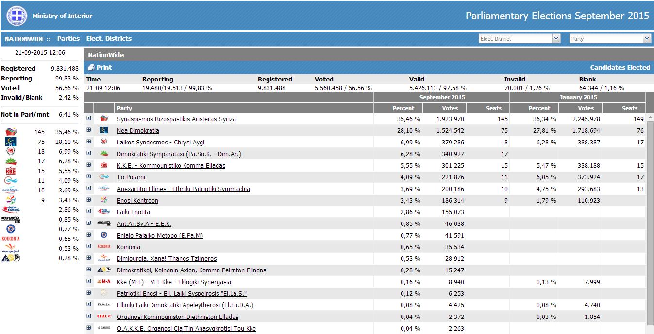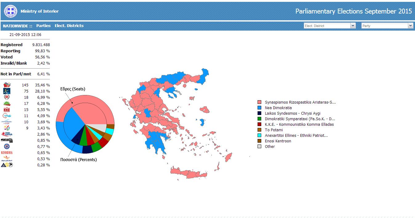 ATENE – Alexis Tsipras e Syriza hanno vinto le elezioni politiche del 20 settembre 2015 col 35,5% dei voti, cioè lo 0,7% in meno rispetto al trionfo di 8 mesi prima, di quel 25 gennaio che vide per la prima volta un partito di sinistra radicale salire al governo in un Paese occidentale. Rispetto ai 149 seggi di gennaio Tsipras perde 4 deputati: ne avrà 145 su 300.