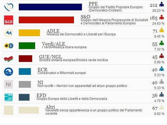 Stima bassa anche per i 40 “non iscritti”, dove vengono inseriti gli eletti del Front National di Marine Le Pen e gli olandesi di Geert Wilders, e i numeri sono quasi certamente sottostimati per i 67 europarlamentari dei cosiddetti “altri partiti”, le formazioni non presenti nel precedente Parlamento europeo, come il Movimento 5 Stelle, gli euroscettici tedeschi di Afd e quelli svedesi di SD e i neonazisti tedeschi dello Npd che sono riusciti a strappare un seggio.