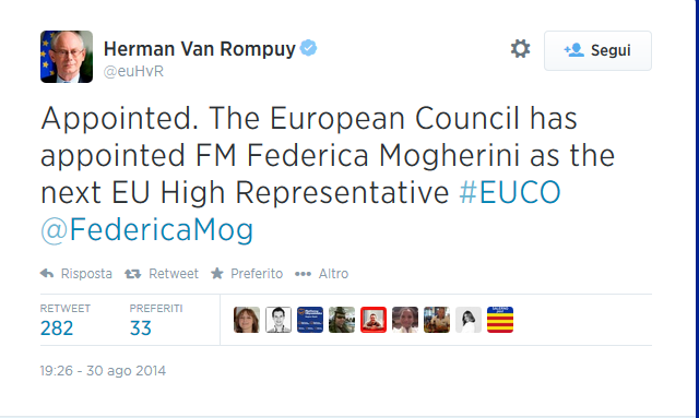 La nomina della Mogherini ad Alto rappresentante della politica estera della Ue è arrivata la sera del 30 agosto dopo una giornata di vertice dei socialisti europei all’Eliseo. Il vertice Ue ha deciso anche di nominare l’attuale premier polacco Donald Tusk presidente permanente del Consiglio Europeo e dell’Eurosummit. Tusk, appartenente alla famiglia dei Popolari, succederà ad Herman Van Rompuy.