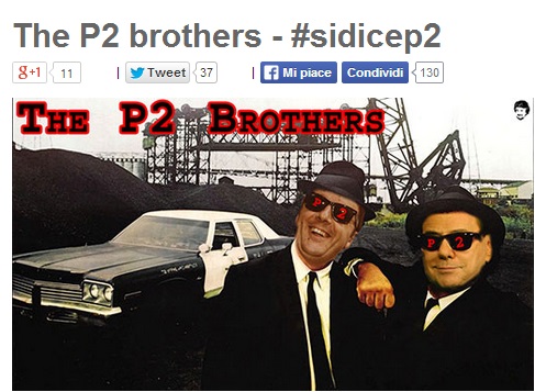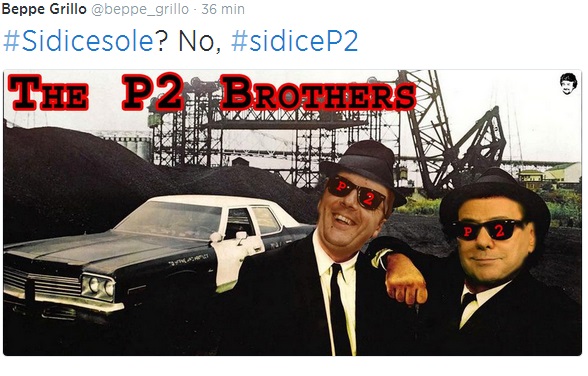 “#Sidicesole? No, #sidiceP2”. scrive Grillo su Twitter mentre sul blog dell’ex comico compare un post-fotografia dal titolo “Th P2 Brothers – #sidicep2″, con l’immagine del presidente del Consiglio e di Silvio Berlusconi nelle vesti dei Blues Brothers.