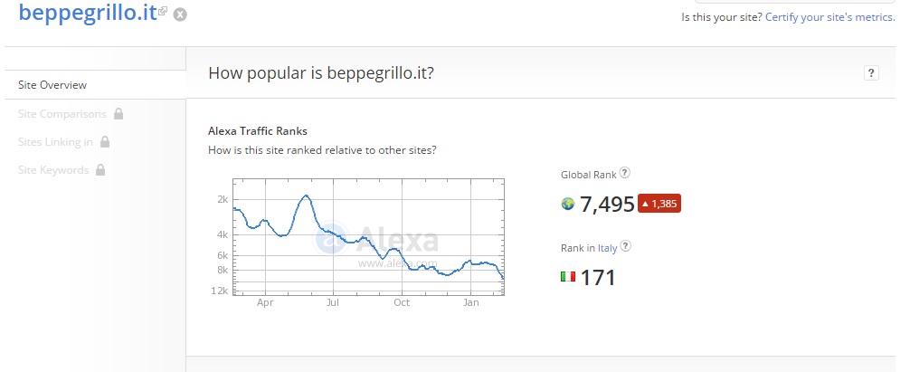 ROMA – Beppe Grillo, il blog non tira più. Lo mostra una impietosa analisi dei dati di traffico del sito che è di fatto organo ufficiale della comunicazione del Movimento 5 Stelle. Secondo il sito Alexa.com, un vero e proprio contatore di tutti i siti web del mondo, oggi beppegrillo.it è al posto numero 171 in Italia e 7495 nel mondo.