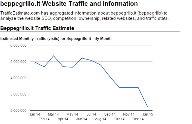 E’ chiaro, sono classifiche diverse elaborate con parametri diversi. A essere oggettivi sono però i numeri. Il blog è in caduta libera in quanto a traffico. Lo mostra Alexa e lo mostra anche Traffic Estimate che mostra come in pochi mesi beppegrillo.it abbia perso diversi milioni di utenti.