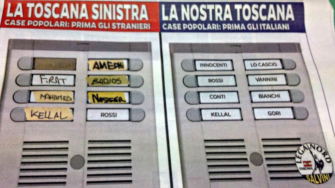Il gruppo toscano del Carroccio ha comprato oggi mezza pagina del Tirreno, ma la stessa pubblicità era apparsa nei giorni scorsi anche sulla Nazione e si prevedono nuove uscite anche sul Corriere Fiorentino. Declinando lo slogan prima gli italiani di Matteo Salvini, i leghisti affermano: “Assegnare le case popolari prima agli italiani è possibile, applicando il modello di Cascina e Arezzo“. Sopra al testo due foto di campanelli: da una parte “La Toscana sinistra – Case popolari: prima gli stranieri” con sette cognomi stranieri, tutti scritti a mano, e uno italiano. Dall’altra “La nostra Toscana – Case popolari: prima gli italiani” con sette cognomi italiani e un solo straniero.