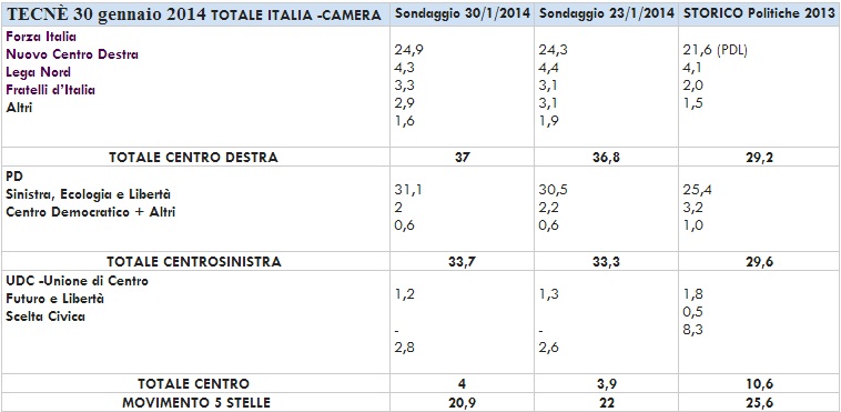 Sono i numeri restituiti da tre diversi sondaggi proprio mentre inizia la discussione parlamentare della legge elettorale Italicum, quella su cui Renzi e Berlusconi hanno trovato l’accordo. Al momento, quindi ancora senza una prospettiva ravvicinata di elezioni, se si andasse a votare secondo due sondaggi su tre sarebbe in vantaggio il centrodestra. In un caso addirittura sarebbe in grado di raggiungere il 37%, ovvero la soglia oltre la quale non c’è bisogno di ricorrere al ballottaggio.