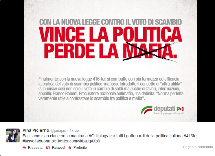 Bersani batte Renzi e la Picierno viene rieletta deputata. Ma il Pd non vince le elezioni, Bersani non riesce a formare un governo e si dimette da segretario. Viene nominato come reggente Guglielmo Epifani e per la Picierno c’è un posto da responsabile Legalità nella nuova segreteria del Pd (maggio 2013). Lei ha il tempo di convertirsi sulla via di Firenze prima che l’onda montante del renzismo travolga avversari e sfidanti alle primarie democratiche di dicembre 2013. Così nella nuova segreteria Renzi l’unica riconfermata è proprio lei, Pina.