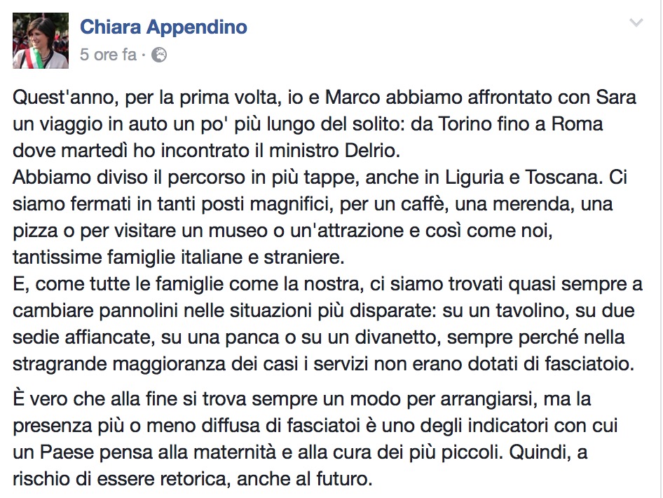 Chiara Appendino su Fb: "Fasciatoio per i bimbi, la mia odissea verso Roma" (Il post su Facebook)