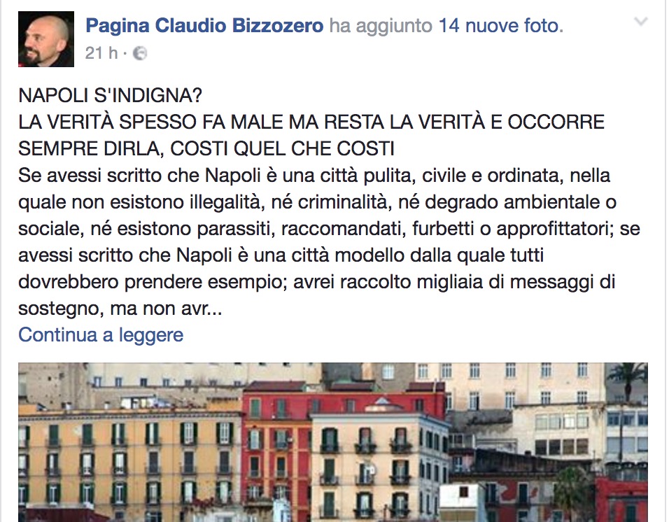 “Se avessi scritto che Napoli è una città pulita, civile e ordinata, nella quale non esistono illegalità, né criminalità, né degrado ambientale o sociale, né esistono parassiti, raccomandati, furbetti o approfittatori; se avessi scritto che Napoli è una città modello dalla quale tutti dovrebbero prendere esempio; avrei raccolto migliaia di messaggi di sostegno, ma non avrei detto la verità”.