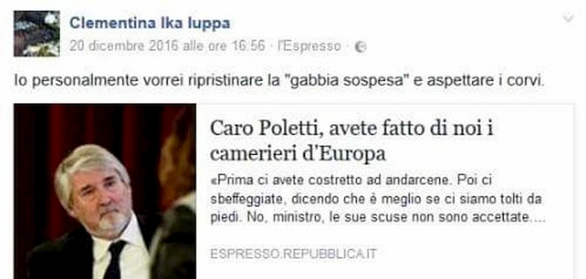 Al post (peraltro scritto da Silvia Scordia, attivista e già candidata M5S) Ika Iuppa ha aggiunto la sua creatività forcaiola: “Io personalmente vorrei ripristinare la ‘gabbia sospesa’ e aspettare i corvi”, suggestioni medievali di efferate punizioni corporali che forse le provengono dai suoi interessi esoterici e misticheggianti, come testimonia il nome “Ika”, assunto in omaggio ad antichi riti pagani di cui è una cultrice.