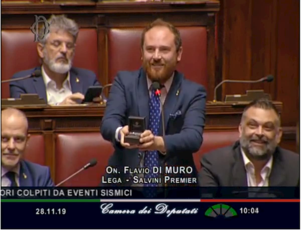 Il leghista Di Muro alla Camera mentre fa la proposta di matrimonio (Ansa)