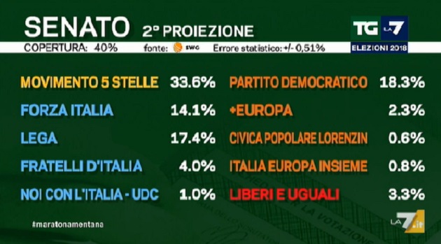 Elezioni 2018: la seconda proiezione La7 per il Senato