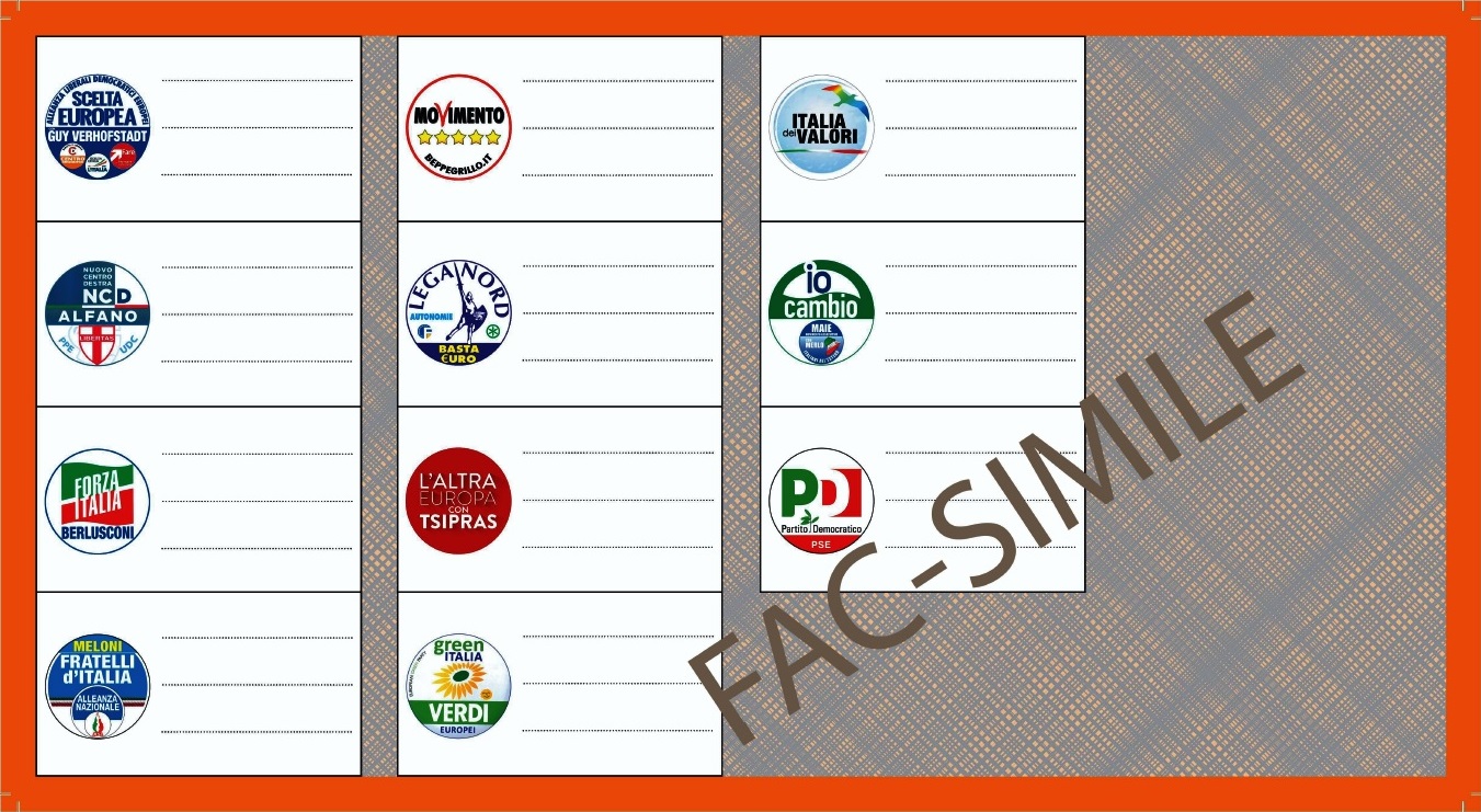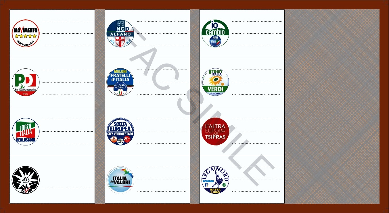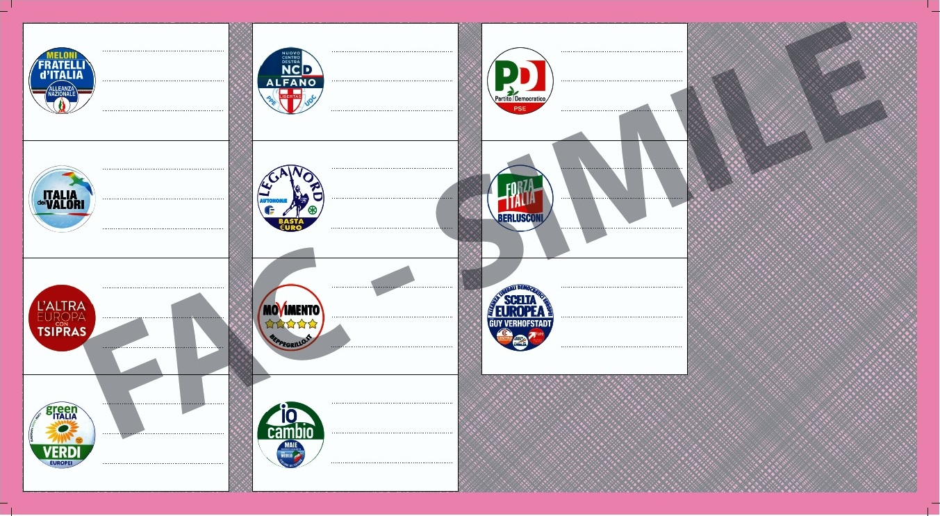 Come si vota alle Europee . Scheda unica di colore diverso in base alle cinque circoscrizioni elettorali: grigia (nord-occidentale), marrone (nord-orientale), rossa (centrale), arancione (meridionale), rosa (insulare). Il voto di lista si esprime tracciando sulla scheda un segno sul contrassegno corrispondente alla lista prescelta. Ciascun elettore puรฒ anche esprimere voti di preferenza, esclusivamente per i candidati compresi nella lista votata (massimo 3, non tutti dello stesso sesso.