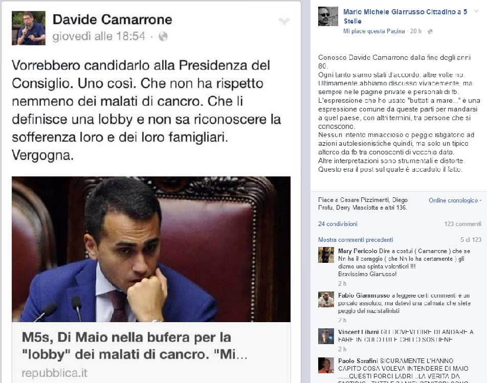 Lo scontro si è consumato su Facebook: tutto è nato da un post in cui Camarrone esprimeva pesanti giudizi sull’uscita infelice di Di Maio, frase che, tra l’altro, aveva già suscitato un polverone di polemiche. Nella vicenda è intervenuto Giarrusso che, in un successivo post, ha invitato Camarrone a mettersi una pietra al collo e suicidarsi, incitando anche altri esponenti dei 5 Stelle a scrivere sulla bacheca del giornalista. “Sono stato intimidito, insultato e minacciato”, racconta Camarrone che ha comunque ricevuto diversi messaggi di solidiarietà dopo l’exploit del politico.