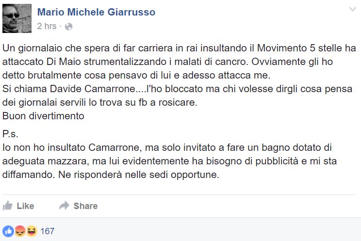 “Ho espresso pubblicamente la mia opinione su una polemica, quella sulla lobby del cancro: questione per me e per molti dolorosa. In conseguenza di ciò, ho letto, su Facebook, una frase a me indirizzata: ‘Ma buttati a mare con una pietra al collo’. Un invito al suicidio, in un post leggibile da chiunque, a firma del senatore Mario Michele Giarrusso, del M5S, che mi ha poi rivolto degli insulti e ha invitato a visitare il mio profilo Fb, che in breve si è riempito di altri insulti: insulti che continuano ad affluire. Oggi, infine, in un’intervista, egli ha sostenuto che strumentalizzassi la morte di mio padre per ragioni politiche. Un atteggiamento odioso, illiberale, violento. Mi rivolgo a lei – conclude – da semplice cittadino, e non da giornalista. Chiedo a lei se sia possibile che un rappresentante del popolo possa usare questi metodi, e se non ritenga di intervenire”.