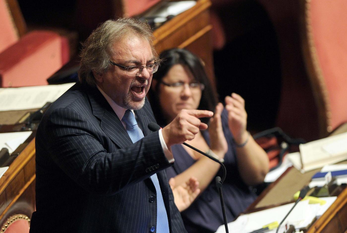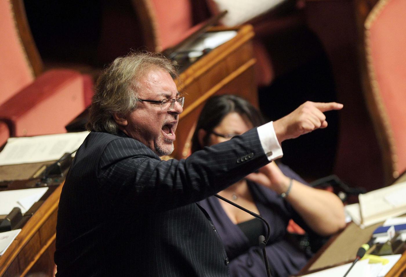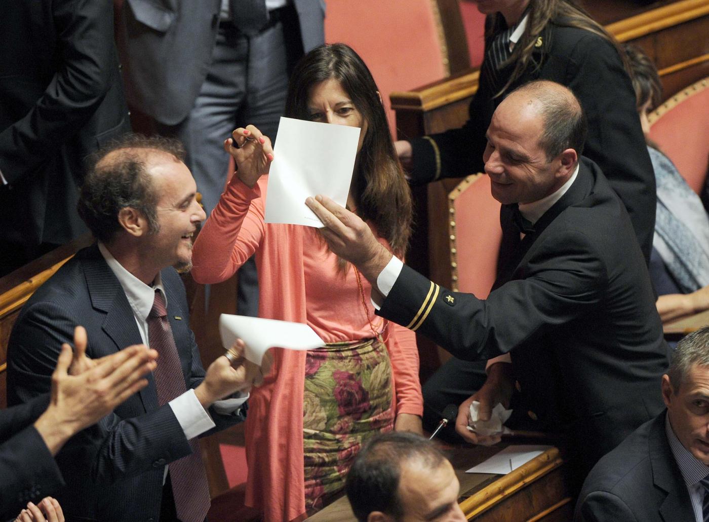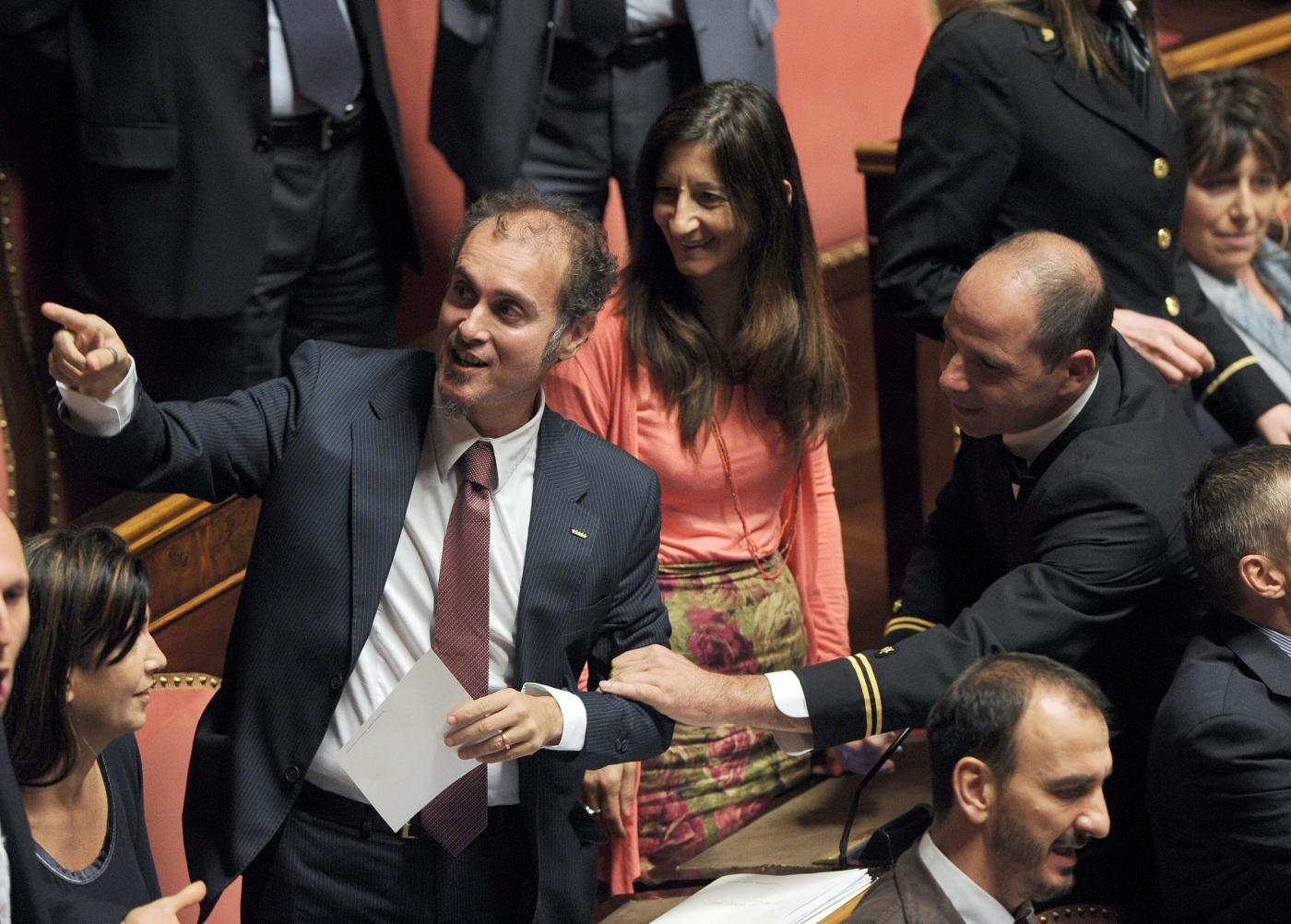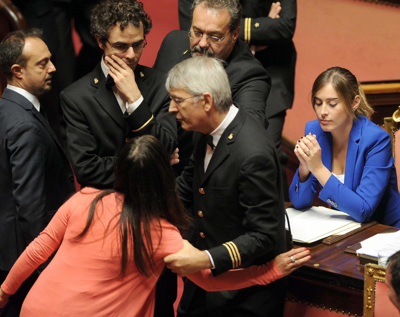Petrocelli però non si è dato per vinto e ha detto: “Non uscirò dall’Aula a meno che non mi portino via con la forza o finché il presidente Grasso non revocherà un provvedimento assurdo”. A quel punto Grasso ne ha ordinato l’espulsione ma i parlamentari pentastellati gli si sono messi tutti intorno, come una sorta di scudo umano, per impedire che i commessi lo portassero fuori. Gli assistenti parlamentari hanno dovuto allontanare i parlamentari 5S uno ad uno mentre alcune senatrici gridavano e protestavano con forza.