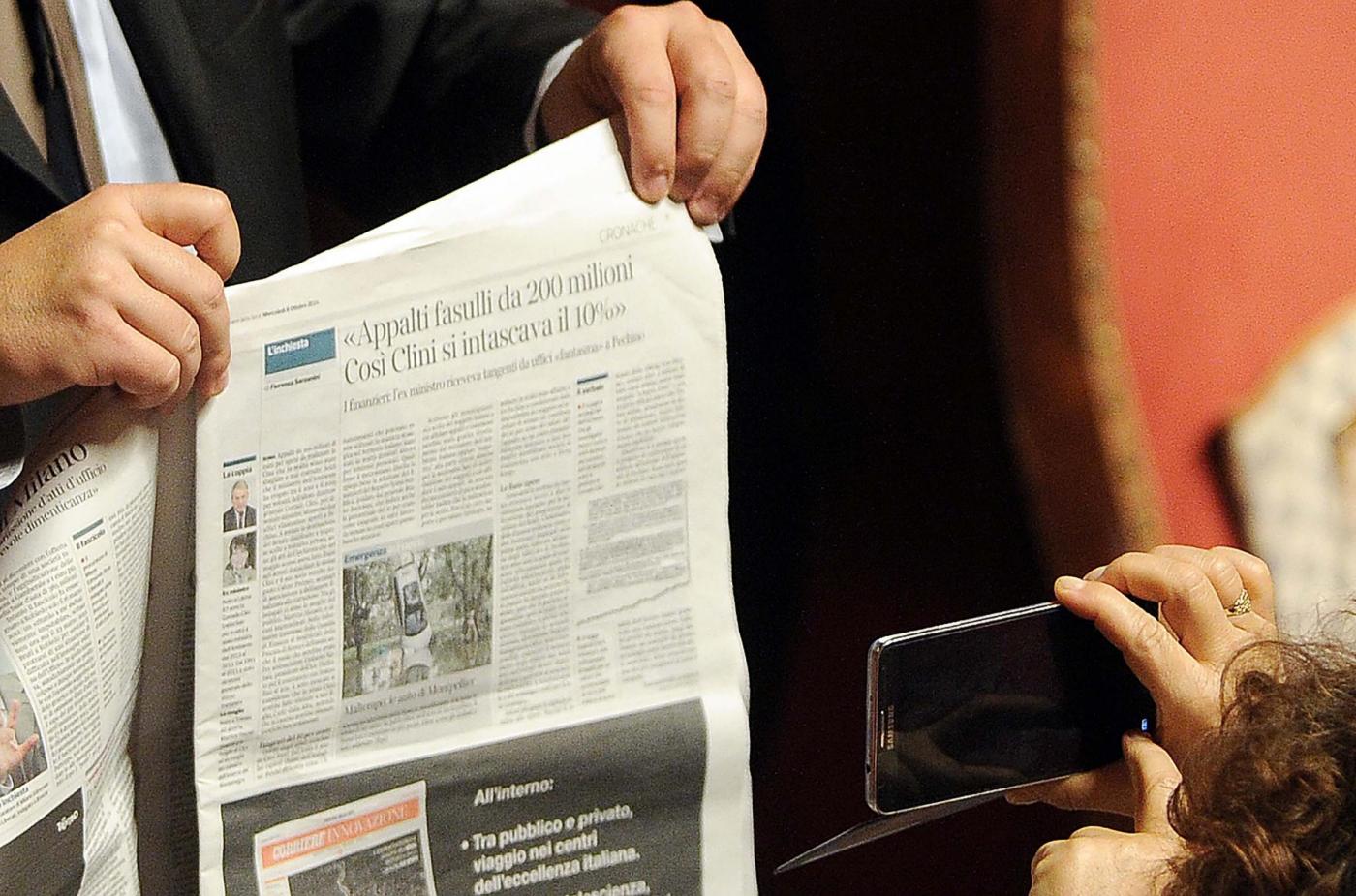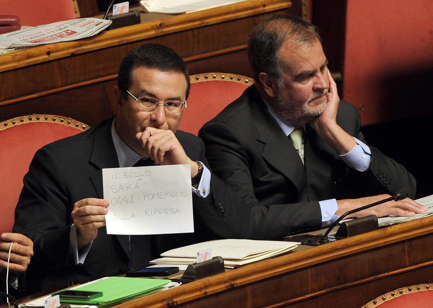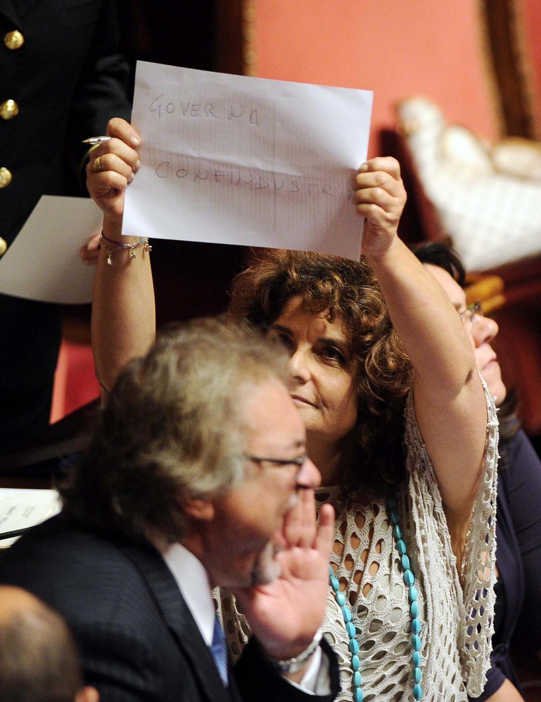 Ma il volo dei fogli è solo l’apice di una giornata di ordinaria follia a Palazzo Madama. Iniziata sempre col Movimento 5 Stelle che prima si barrica in Aula dicendo di non voler uscire e poi esce. Poi ci sono i Parlamentari del Pd che presentano un documento (in tutto 35 di cui 26 senatori) per dire che non sono d’accordo ma che voteranno la fiducia. E il ministro del Lavoro Giuliano Poletti che, dopo l’annuncio della richiesta della fiducia sul Jobs Act, prova finalmente a spiegare cosa ci sarà in questa legge delega. Non parlando in Aula come fatto stamattina ma depositando l’intero discorso agli atti. Perché tutto, nella mattinata caos di Palazzo Madama, non era riuscito neppure a leggerlo.