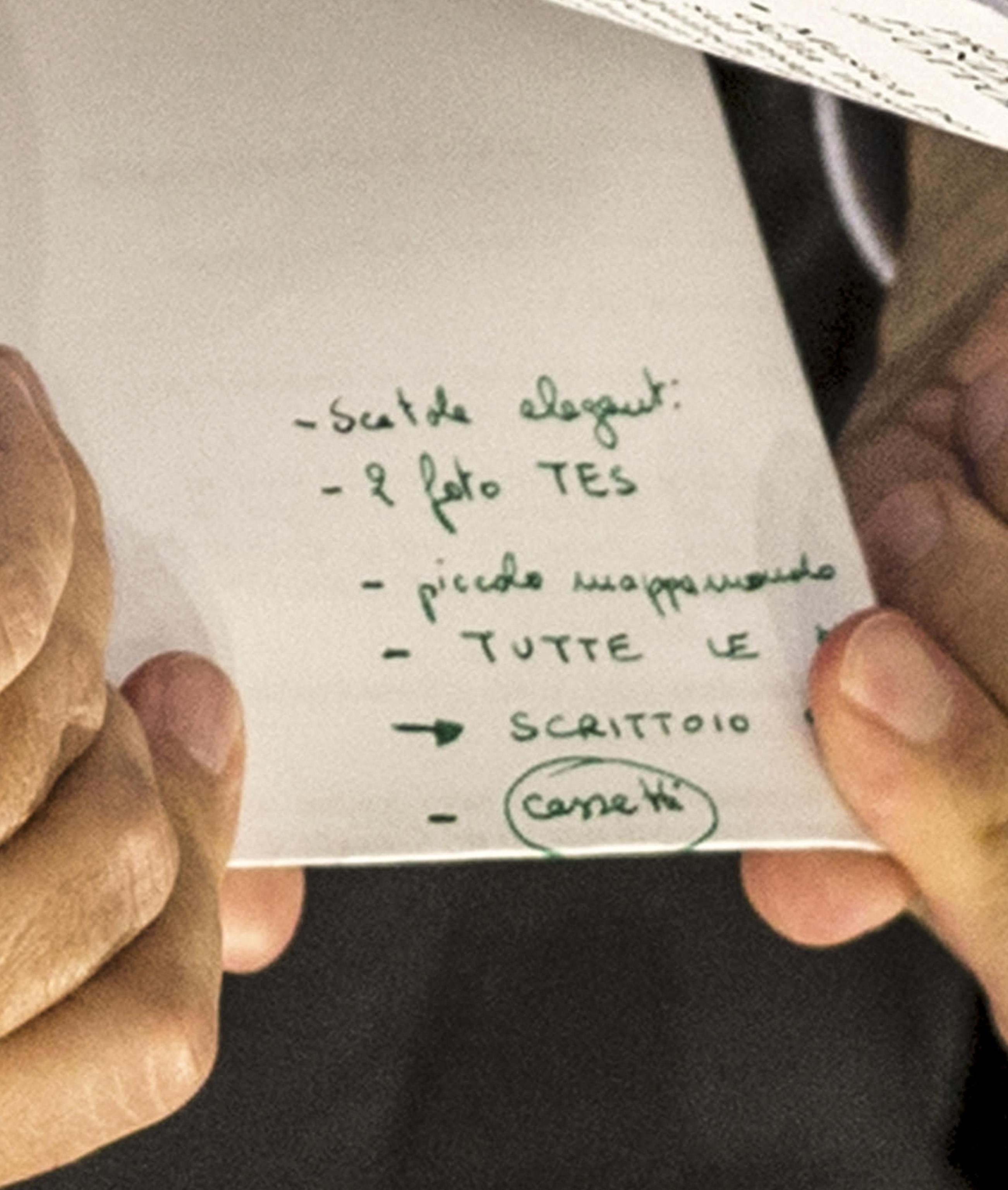 E a scorrere cosa dicono quegli appunti: “Scatole eleganti, due foto Tes (tessera?, ndr), piccolo mappamondo, scrittoio, cassetti”, viene immediatamente da pensare ad una lista di cose da portare via, ad una lista trasloco. Le ultime due parole sono evidenziate, la prima da una freccia e la seconda è inscritta in un cerchio. Tutto scritto nel colore dell’inchiostro preferito da sindaco Marino, il verde. Proprio come Palmiro Togliatti.