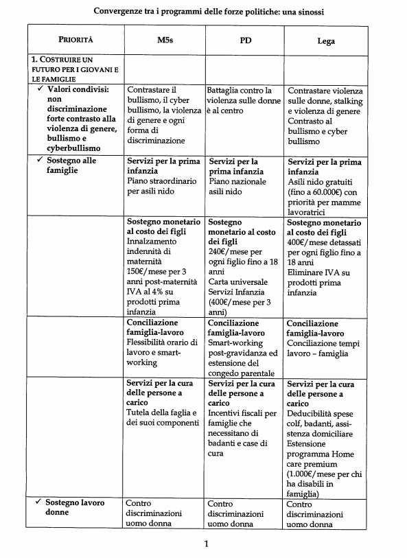Tra i 10 punti del contratto, una sintesi tra i programmi di M5s, Lega e Partito Democratico, si legge: costruireย un futuro per i giovani delle famiglie, contrastare la povertร e la disoccupazione, eliminare gli squilibri territoriali, sicurezza e giustizia per i cittadini, difendere e rafforzare il servizio sanitario nazionale, proteggere le imprese, nuovo rapporto tra cittadino e fisco, rinnovare le infrastrutture, proteggere dai rischi e salvaguardare l’ambiente e una amministrazione efficiente e trasparente.