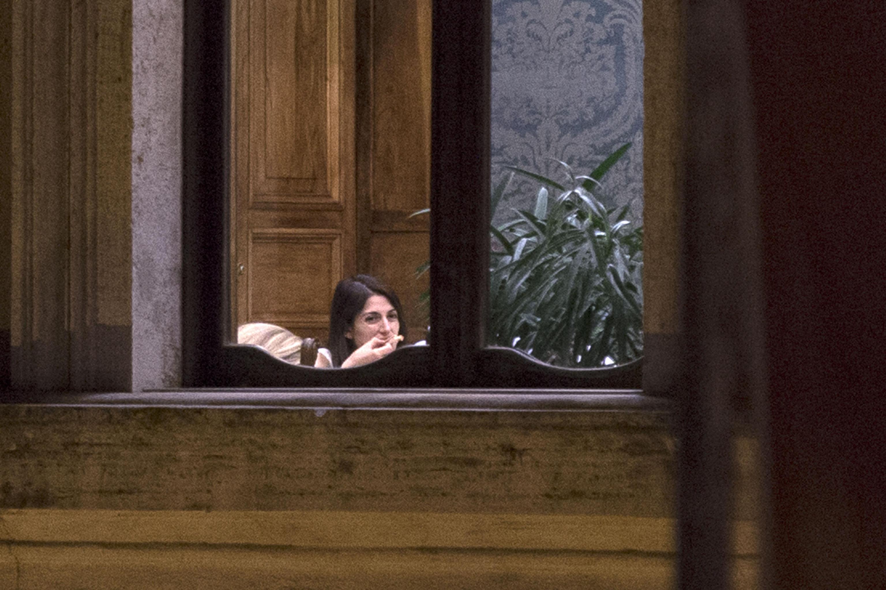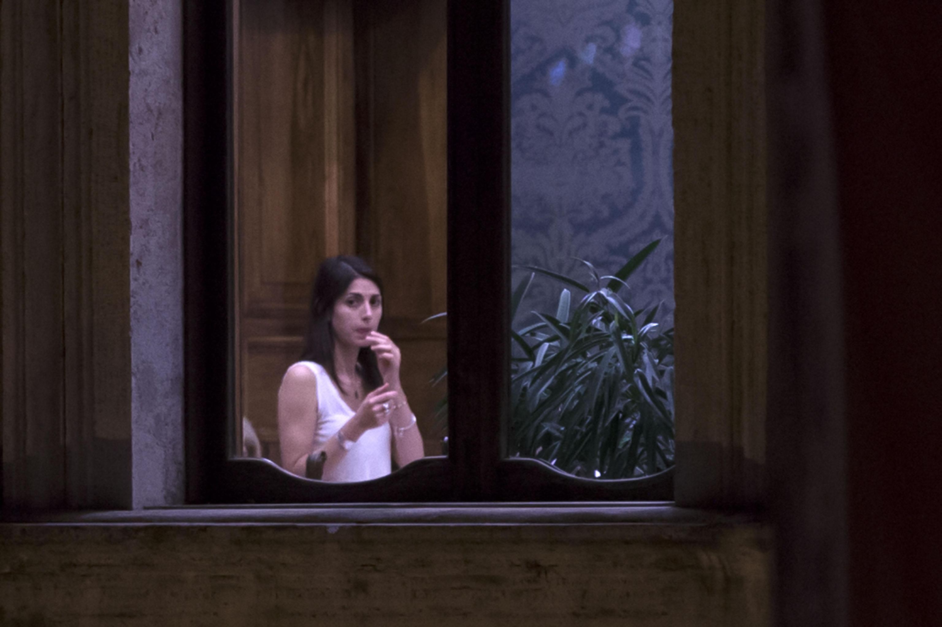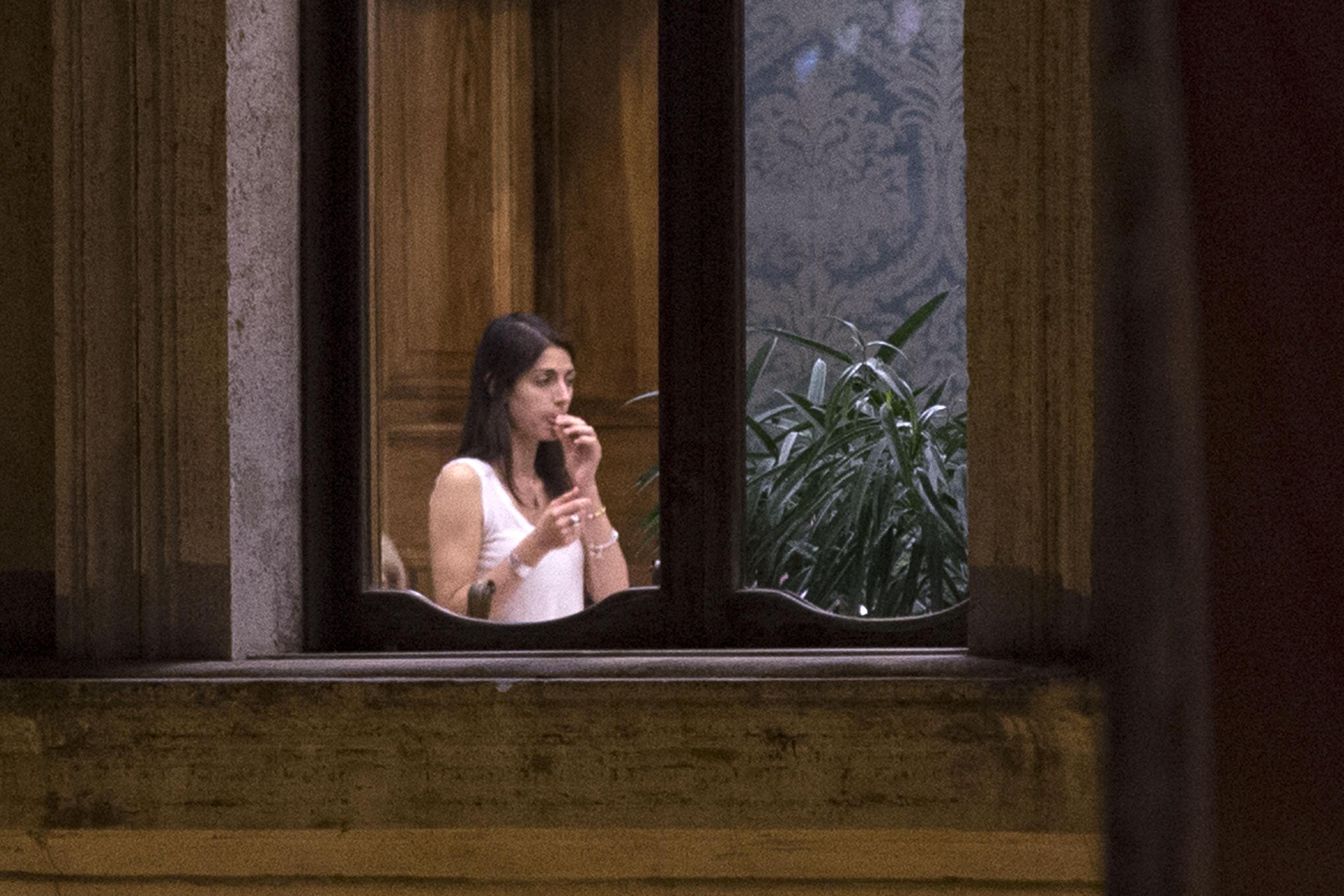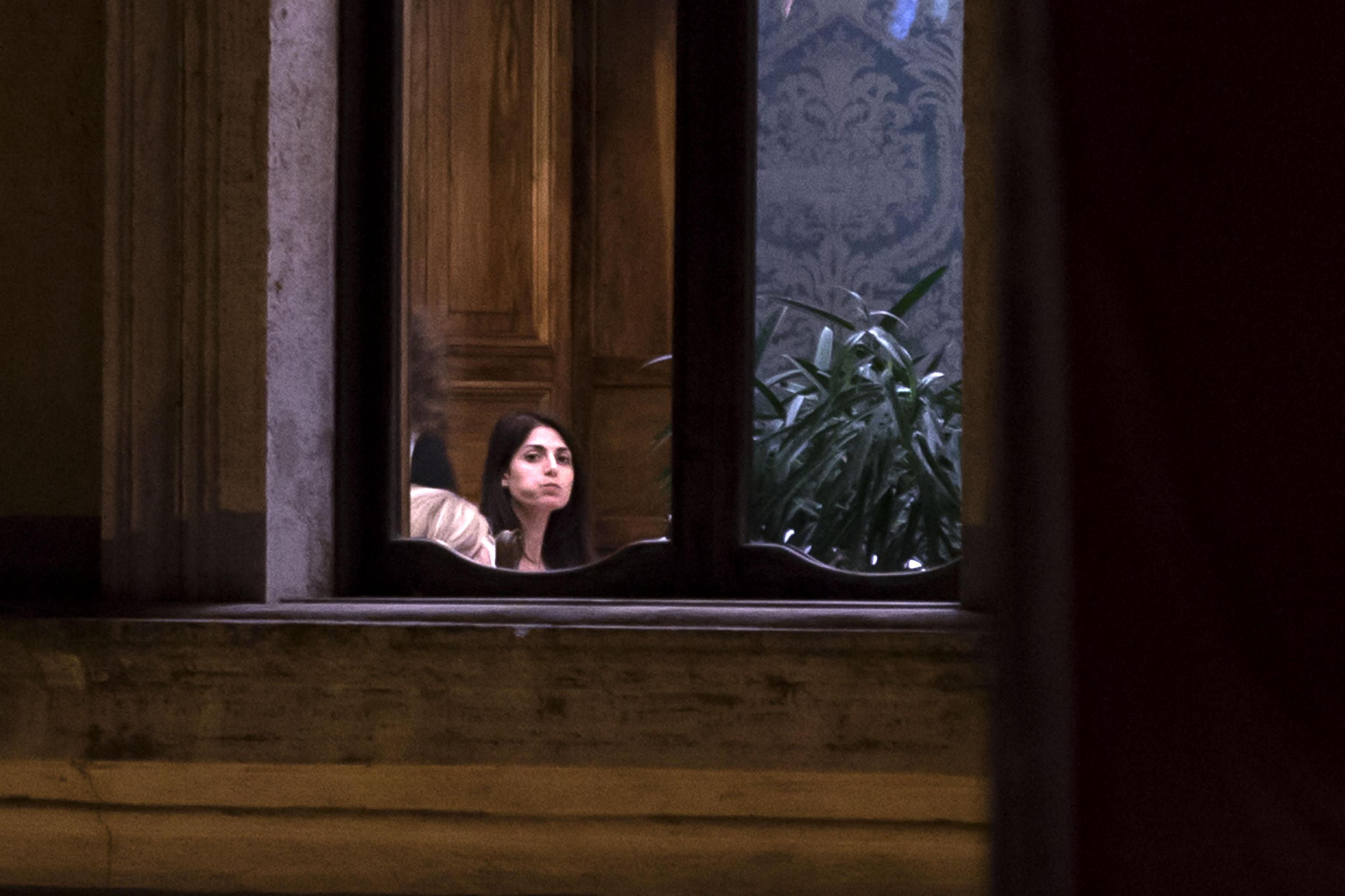 La Raggi fotografata durante una pausa della riunione fiume che si è tenuto nel pomeriggio di martedì 6 settembre (foto Ansa).