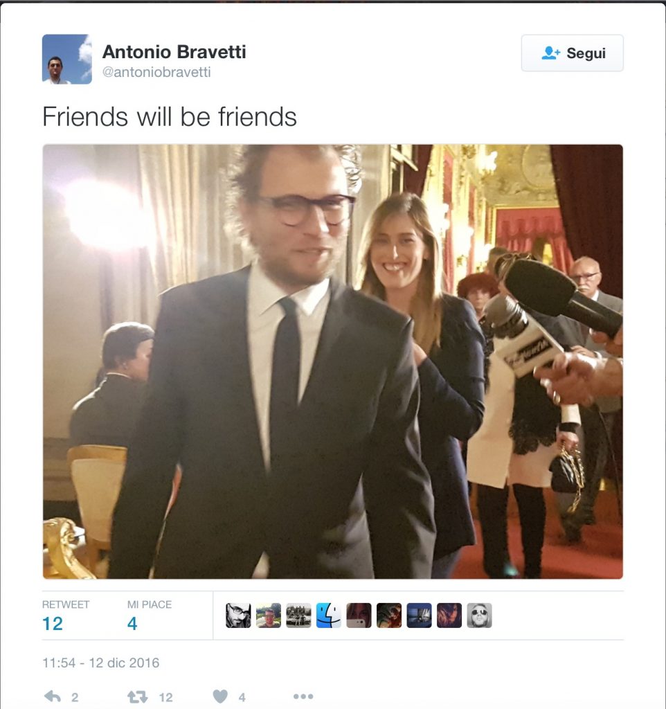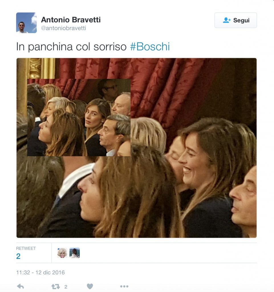 Mentre ai più sembrava normale che la Boschi sorridesse accanto a Renzi e Gentiloni, quasi facendo gli onori di casa, un giornalista dell’Agenzia Dire, Antonio Bravetti, ha fotografato l’ex ministro delle Riforme nel parterre dei parenti dei ministri, quando è arrivato il momento della foto di gruppo: