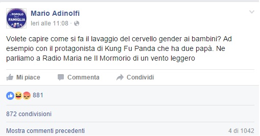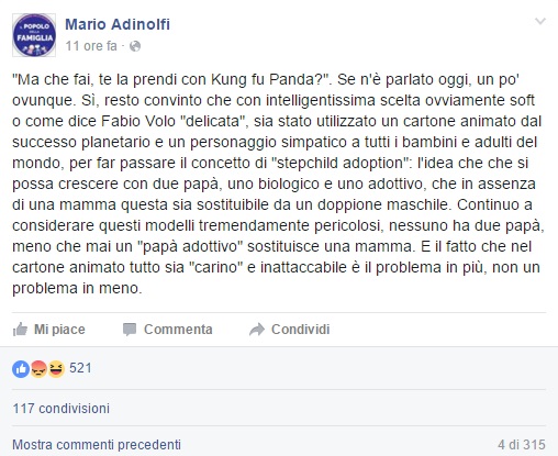 “”Ma che fai, te la prendi con Kung fu Panda?”. Se n’è parlato oggi, un po’ ovunque. Sì, resto convinto che con intelligentissima scelta ovviamente soft o come dice Fabio Volo “delicata”, sia stato utilizzato un cartone animato dal successo planetario e un personaggio simpatico a tutti i bambini e adulti del mondo, per far passare il concetto di “stepchild adoption”: l’idea che che si possa crescere con due papà, uno biologico e uno adottivo, che in assenza di una mamma questa sia sostituibile da un doppione maschile. Continuo a considerare questi modelli tremendamente pericolosi, nessuno ha due papà, meno che mai un “papà adottivo” sostituisce una mamma. E il fatto che nel cartone animato tutto sia “carino” e inattaccabile è il problema in più, non un problema in meno”.