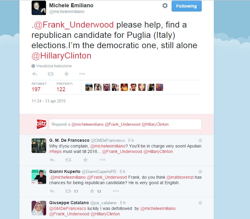 “@Frank_Underwood please help, find a republican candidate for Puglia (Italy) elections. I’m the democratic one, still alone @HillaryClinton”
