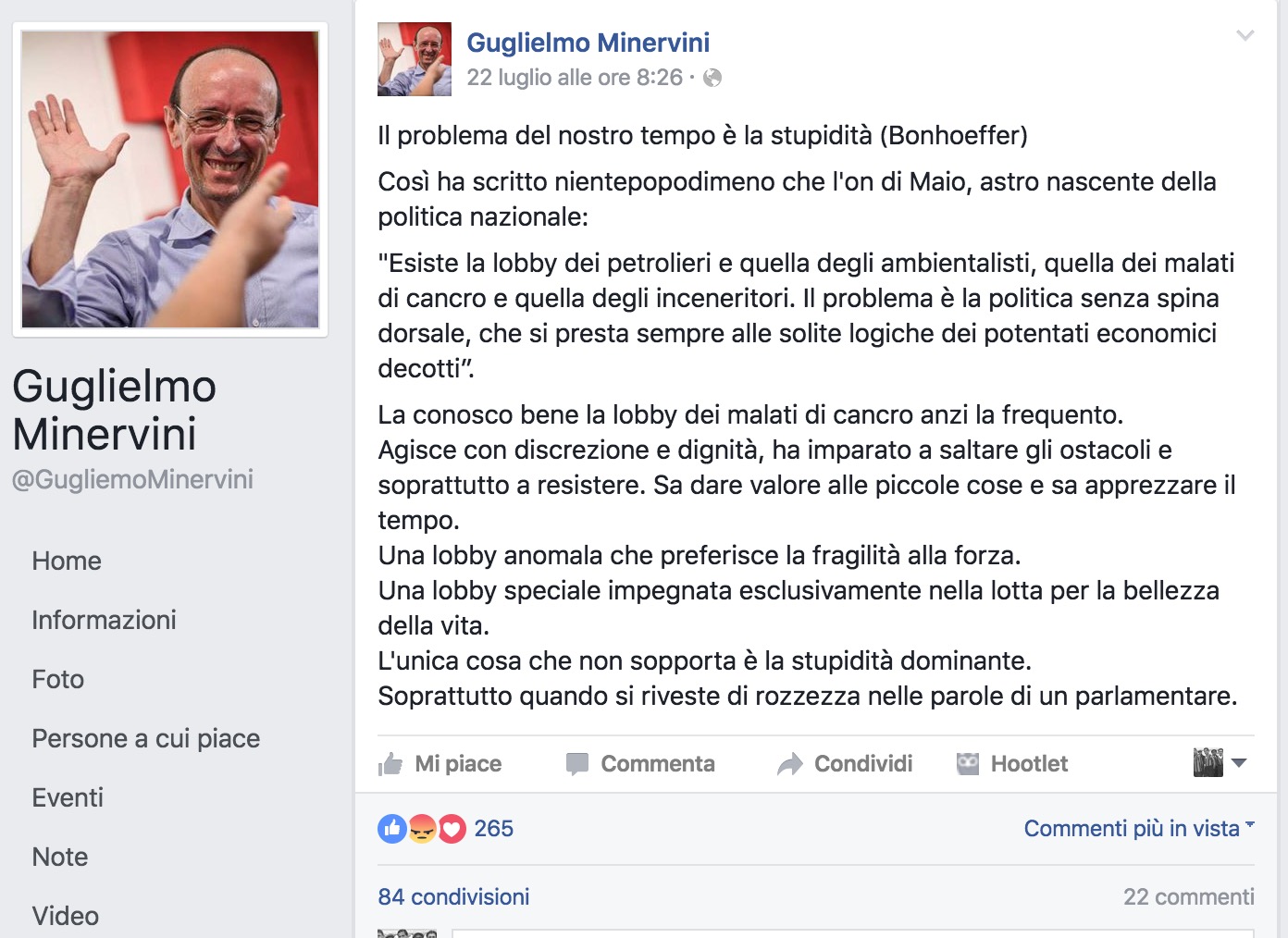 La conosco bene la lobby dei malati di cancro anzi la frequento.