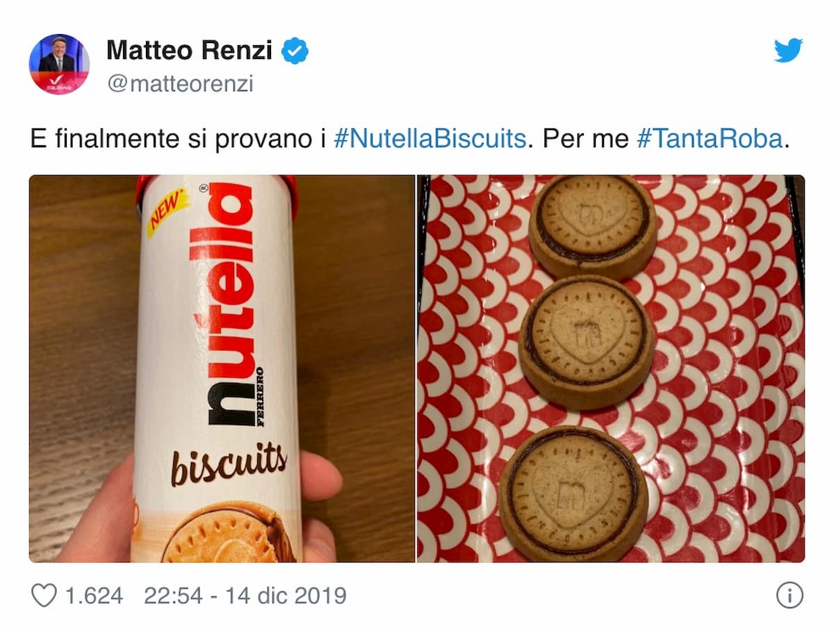 A rivelare ai più l’esistenza della confezione non c’ha pensato la Ferrero e nemmeno qualche agenzia di marketing, ma l’ex presidente del Consiglio Matteo Renzi. Dopo aver accusato l’altro Matteo, Salvini, di attaccare la Nutella “nei giorni di Ilva, Alitalia, legge di bilancio, summit Nato” per “sembrare più vicino al popolo”, adesso anche lui cavalca quello che nel frattempo è diventato uno degli hashtag più popolari e così twitta la foto del tubo: “E finalmente si provano i #NutellaBiscuits. Per me #TantaRoba”.