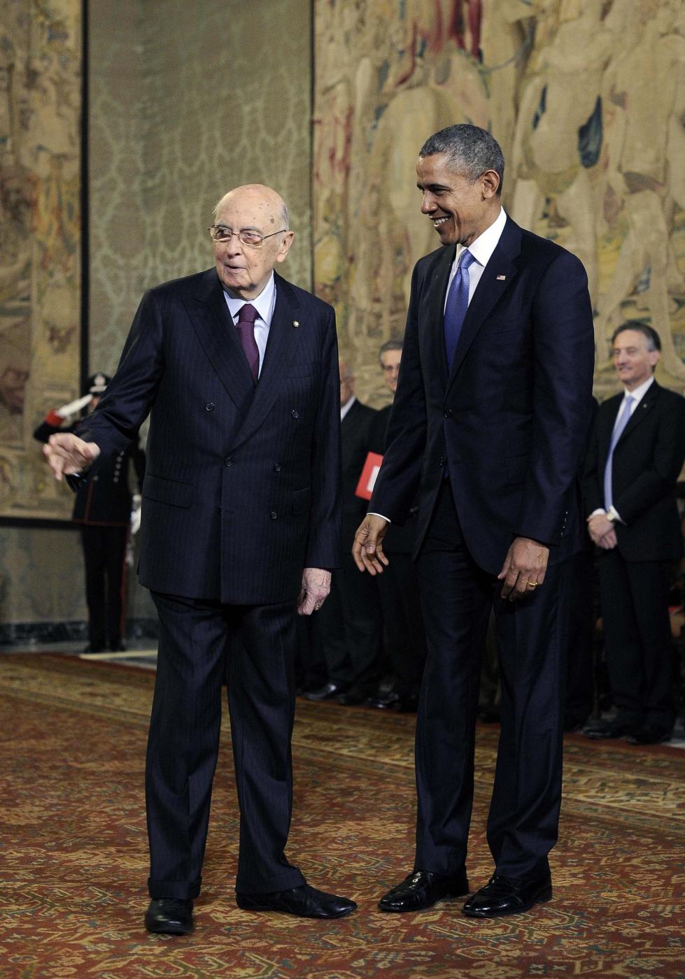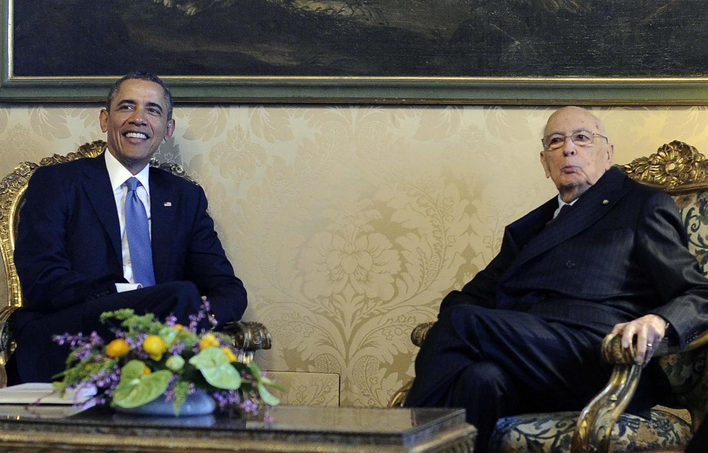 Quindi parole di circostanza per definire “affascinante” la sfida lanciata da Barack Obama alle relazioni tra Ue e Usa e per sottolineare che “il dialogo di oggi conferma la grande amicizia e partnership” Obama, in un primo a momento aveva rispettato orari e protocollo alla lettera. Una giornata fitta quella del presidente, iniziata alle 10:20 del mattino con l’arrivo in Vaticano. Qui l’incontro con Papa Francesco. Poco meno di un’ora di colloquio riservato da cui Obama è uscito sorridente (forse più di Francesco) e che il presidente ha definito “meraviglioso”. Difficile non pensare, per Obama, a un tentativo di riguadagnare popolarità a casa. “Halo effect” (effetto aureola) lo chiamano gli americani. Subito dopo è stata la volta di Giorgio Napolitano. Qui incontro più breve, 20 minuti, corredato da un pranzo ufficiale. Neppure il tempo di digerire e il presidente, in ritardo di una mezz’ora, ha ripreso posto in auto (28 i mezzi di scorta che girano in una capitale super presidiata) per arrivare al Senato dove lo aspetta Matteo Renzi.
