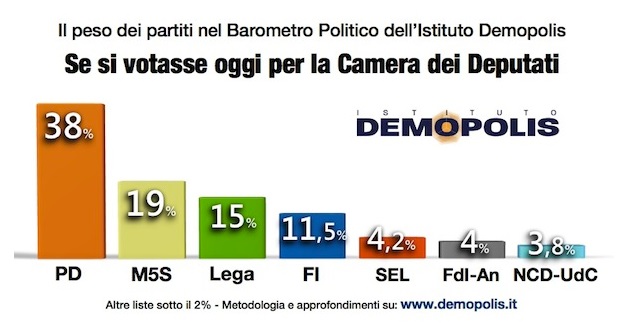 ROMA – Resta stabile il quadro delle intenzioni di voto rilevate dal sondaggio dell’Istituto Demopolis: con una distanza tra i primi due partiti che sfiora i 20 punti percentuali, le principali novità sembrano riguardare il posizionamento all’interno dell’area di Centro Destra. Se si votasse oggi per la Camera dei Deputati, secondo i dati dell’Istituto diretto da Pietro Vento, il PD otterrebbe il 38%, con il Movimento 5 Stelle attestato al 19%.