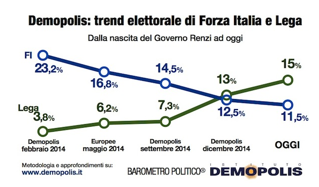 La Lega di Salvini si consolida con il 15% quale terza forza politica, mentre si ridimensiona ulteriormente il peso elettorale di Forza Italia, oggi all’11,5%. Più distanti, intorno al 4%, Sel, Fratelli d’Italia e Area Popolare, inclusiva dell’UdC e dell’NCD di Alfano. Come emerge dal trend dell’Istituto Demopolis, gli ultimi mesi hanno visto soprattutto un significativo mutamento degli equilibri in seno all’area di Centro Destra, con una progressiva riduzione del peso elettorale del partito di Berlusconi, passato dal 23,2% del febbraio 2014 all’11,5% odierno. Inversamente proporzionale appare invece la crescita della Lega di Salvini: dal 3,8% di un anno fa al 15% di oggi: oltre 3 punti sopra Forza Italia.