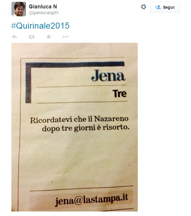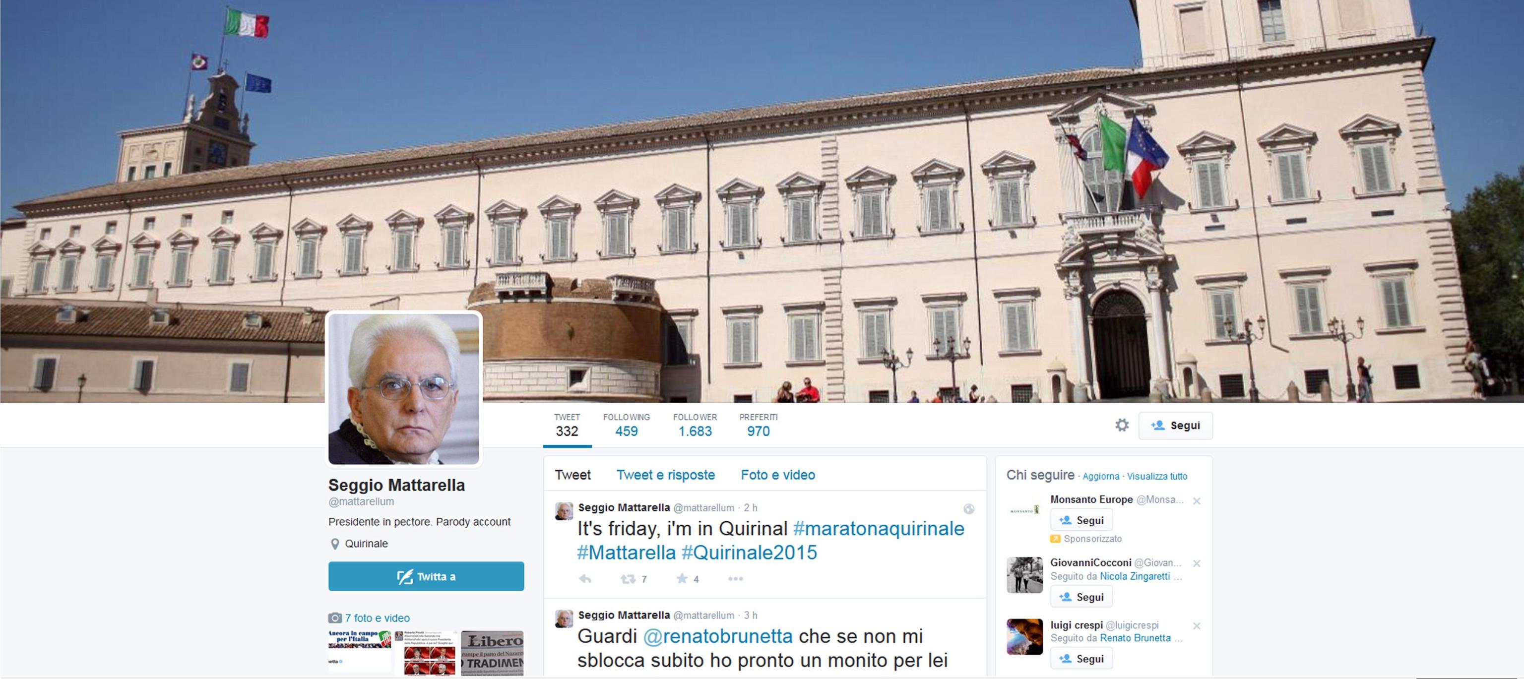 16.02 – Su Twitter c’è un account falso di Sergio Mattarella: “Seggio Mattarella“. Il profilo – nato con tempismo il 28 gennaio – si chiama appropriatamente @mattarellum, come la legge elettorale che appunto prende il nome dal candidato in pectore al Colle più alto. L’account – chi lo gestisce per adesso fa sfoggio di una satira molto soft – conta già oltre 1.600 follower. Uno dei tweet più graditi recita: “Avviso per i gufi: sono ignifugo, non mi brucia nessuno!”.