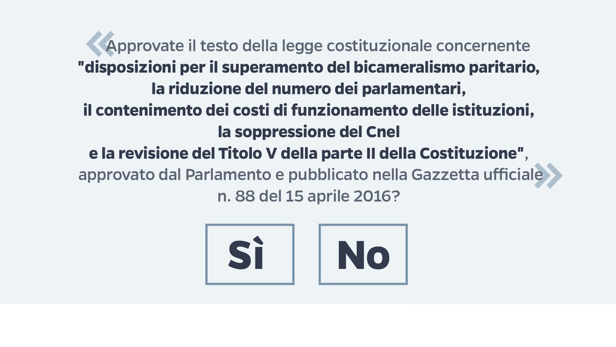 “Approvate il testo della legge costituzionale concernente ‘disposizioni per il superamento del bicameralismo paritario, la riduzione del numero dei parlamentari, il contenimento dei costi di funzionamento delle istituzioni, la soppressione del Cnel e la revisione del Titolo V della parte II della Costituzione’, approvato dal Parlamento e pubblicato nella Gazzetta ufficiale n. 88 del 15 aprile 2016?”.