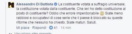 Qualcosa non torna. La Costituzione, infatti, fu sì approvata nel 1948, ma fu votata dall’assemblea Costituente, quella sì eletta a suffragio universale. Un errore non banale dovuto probabilmente alla foga con cui sosteneva le ragioni del no. Lo scivolone dell’esponente M5s causa ovviamente dibattito, soprattuto sui social network. Alla fine è lo stesso Di Battista a intervenire su Facebook con un post in cui cerca di minimizzare il suo errore: