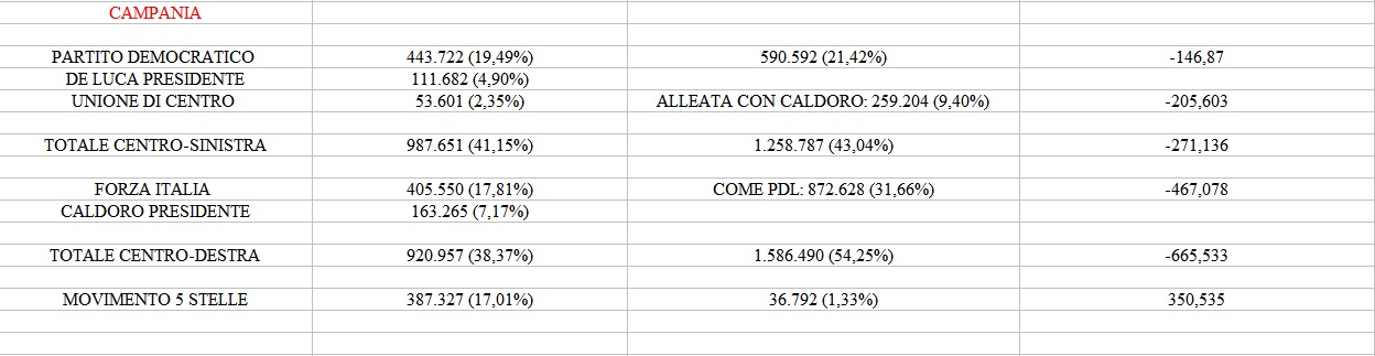 Il Movimento 5 Stelle, che nel 2010 non c’era, ha preso 387.327 voti, la sua candidata Valeria Ciarambino 420.617 voti. Colpisce anche il confronto fra i due sfidanti, sempre gli stessi a ruoli invertiti. Nel 2010 Caldoro vinse con 1.586.567 voti, cinque anni dopo ha perso con 920.957 voti. Nel 2010 De Luca perse con 1.258.715 voti, questa volta ha vinto con 987.651 voti.