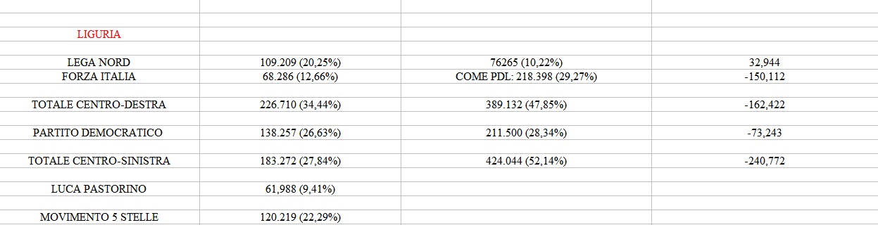 La Lega Nord ha incassato 109.209 voti guadagnando 32.944 voti rispetto alle regionali del 2010, quando ne aveva presi 76.265. Perde una barca di voti Forza Italia (nel 2010 Pdl): il 31 maggio ha preso 68.286 voti, ai quali aggiungendo i 8.408 della lista “Liguria Libera” (di Enrico Musso, ex Pdl presentatosi da solo) si arriva a 76.694 voti. Nel 2010 il Pdl prese 218.398 voti, che diventano 269.057 se si aggiungono i 45.261 voti della Lista Biasotti e i 5.398 di Gente d’Italia. Quindi fanno 150 mila voti in meno al partito Forza Italia e  192.343 voti in meno se si allarga il discorso alle liste collegate. Il Movimento 5 Stelle sale da 0 (non si presentò nel 2010) a 120.219 voti.
