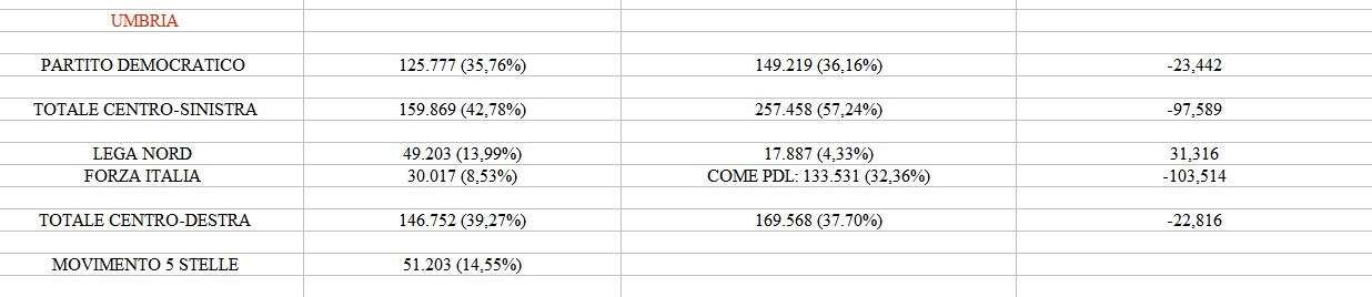 Il Movimento 5 Stelle debutta da secondo partito della Regione con 51 mila voti. Nel 2010 Catiuscia Marini prese 257.458 voti, questa volta si è fermata a 159.869 voti. Il centrodestra nel 2010 candidò Fiammetta Modena, che prese 169.568 voti. Di più dei 146.752 con i quali Claudio Ricci ha sfiorato la vittoria.