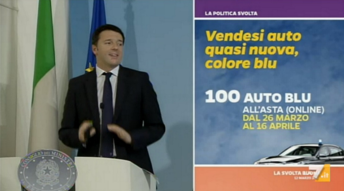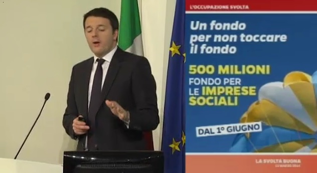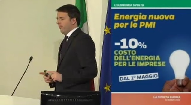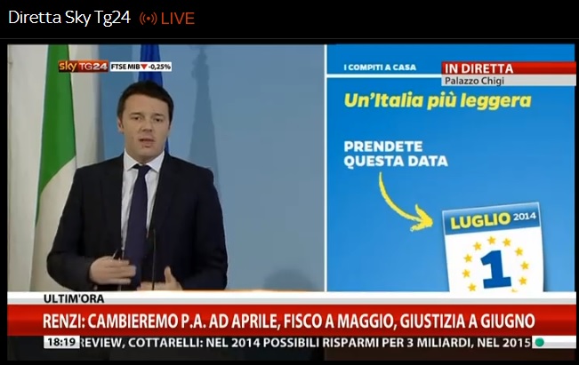 Indica una data, il 1° luglio, in cui l’Italia dovrebbe diventare “più leggera”, grazie a quelle riforme alle quali ha accennato. Accanto a lui scorrono delle slide che spiegano le sue intenzioni in pochi brevi slogan, come in una presentazione aziendale.