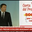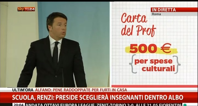 CARTA DEI PROFESSORI. Tra le altre novità previste alla vigilia c’è la cosiddetta Carta dei Prof: un piccolo plafond da 500 euro l’anno da spendere esclusivamente per le attività culturali: dal libro al teatro. “Per la carta del prof – spiega Renzi – abbiamo deciso 500 euro per le spese culturali, ogni anno un professore potrà spendere 500 euro solo per spese di natura culturale, un libro per approfondire o andare a teatro”.