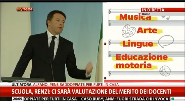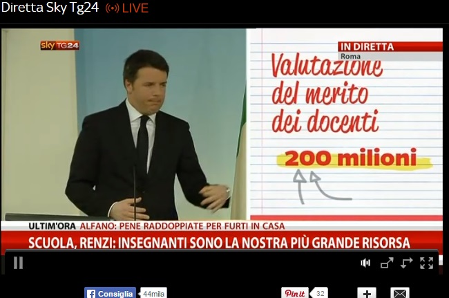 SCATTI E MERITO. Renzi nega che non ci saranno scatti retributivi dei prof “Abbiamo scelto di mantenere gli scatti di anzianità per i professori, ma con una cifra aggiuntiva sul merito. Le modalità su cui ciascuna scuola premierà saranno decise dal preside”. Lo ha spiegato Renzi, aggiungendo che sono stati messi in campo 200 milioni dal 2016.