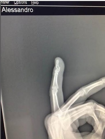Onorato su Facebook ha postato alcune foto in cui si vedono le escoriazioni, la lastra con il dito rotto e una corsia di ospedale ed ha commentato così la vicenda: