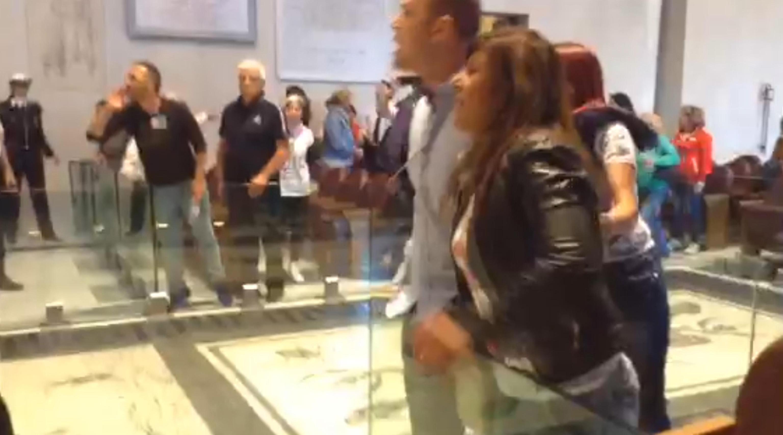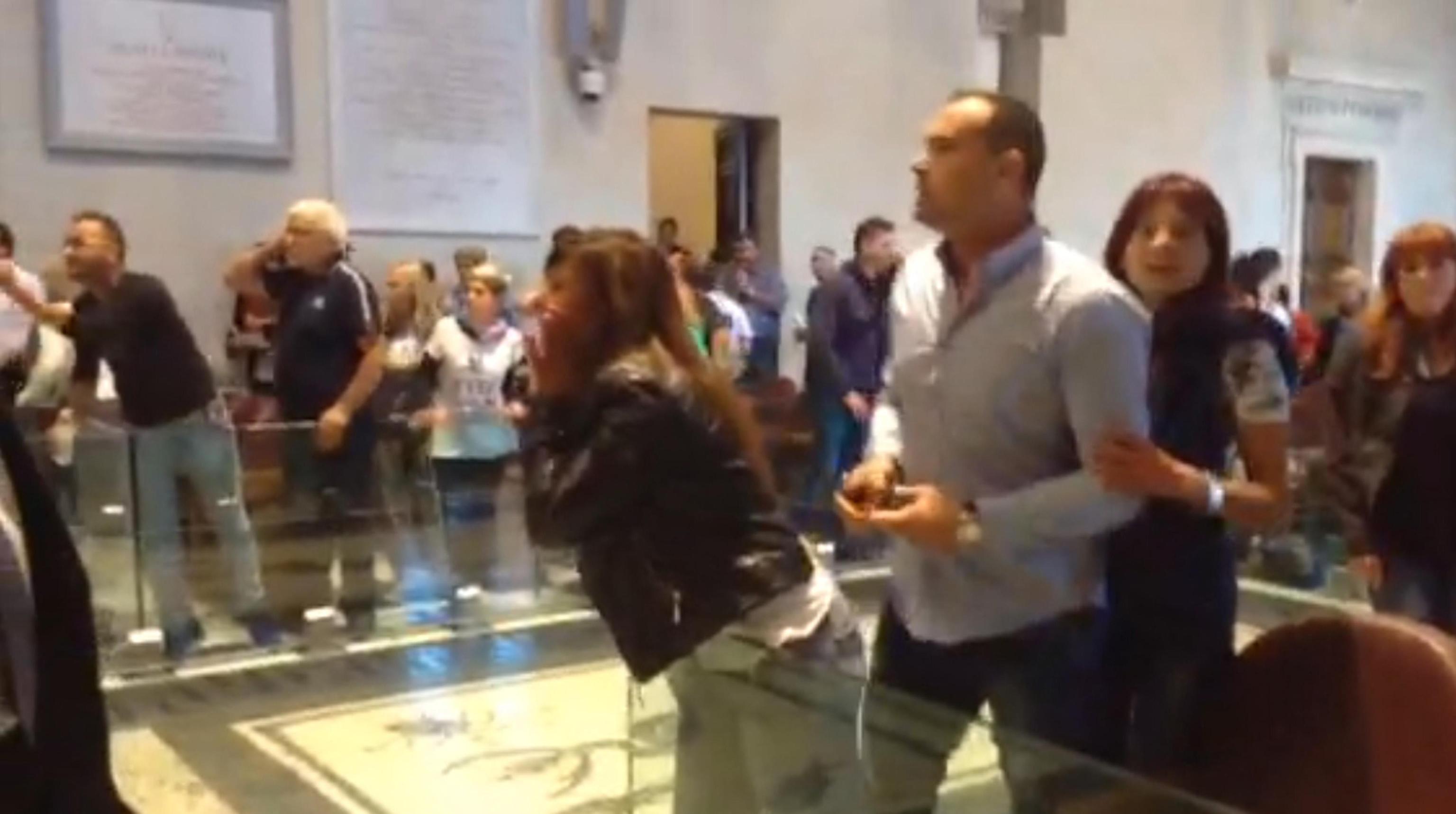 La violenta lite in conferenza dei capigruppo ha appesantito il clima già infuocato in Assemblea capitolina dopo la rabbia in Aula Giulio Cesare dei dipendenti della Roma Multiservizi. A quanto si apprende da fonti di entrambi gli schieramenti, nella riunione dei presidenti convocata al termine della seduta e della energica protesta dei lavoratori della Roma Multiservizi, tra i consiglieri Gianluca Peciola (Sel) e Alessandro Onorato (Lista Marchini) sono volate parole grosse e addirittura una sedia – una di quelle robuste che arredano la sala delle Bandiere del Campidoglio – che il vendoliano avrebbe lanciato al collega, reo a suo avviso – racconta qualche testimone – di aver fomentato la protesta dei lavoratori della municipalizzata strumentalizzandoli.