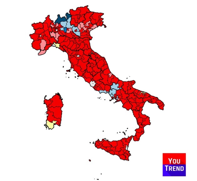 YouTrend poi simula uno scenario come quello delle Europee 2014, quando il Pd di Renzi sfondò la soglia del 40%. In un simile scenario la mappa dei collegi è altrettanto eloquente: se le prossime elezioni dovessero regalare gli stessi risultati delle Europee 2014, avremmo quella che in inglese si definisce una landslide del PD e dei suoi alleati minori: pochissimi collegi sarebbero vinti (peraltro con un margine ridotto, nella quasi totalità dei casi) dalle coalizioni avversarie.