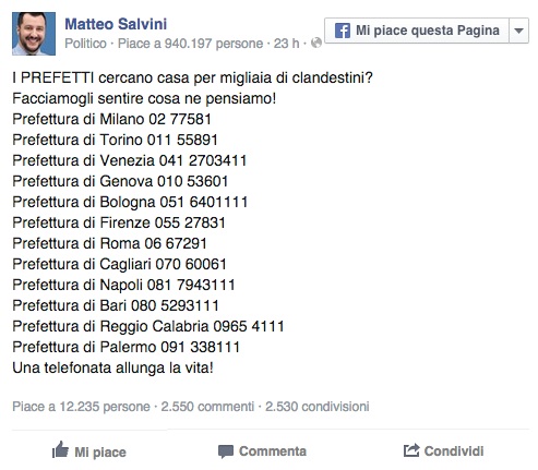 Ora Salvini lancia un vero e proprio atto di guerra e sulla sua pagina Fb scrive: “I prefetti cercano casa per migliaia di clandestini? Facciamogli sentire cosa ne pensiamo!”. Segue un elenco di numeri di telefono dei principali uffici prefettizi italiani. E conclude: “Una telefonata allunga la vita”.